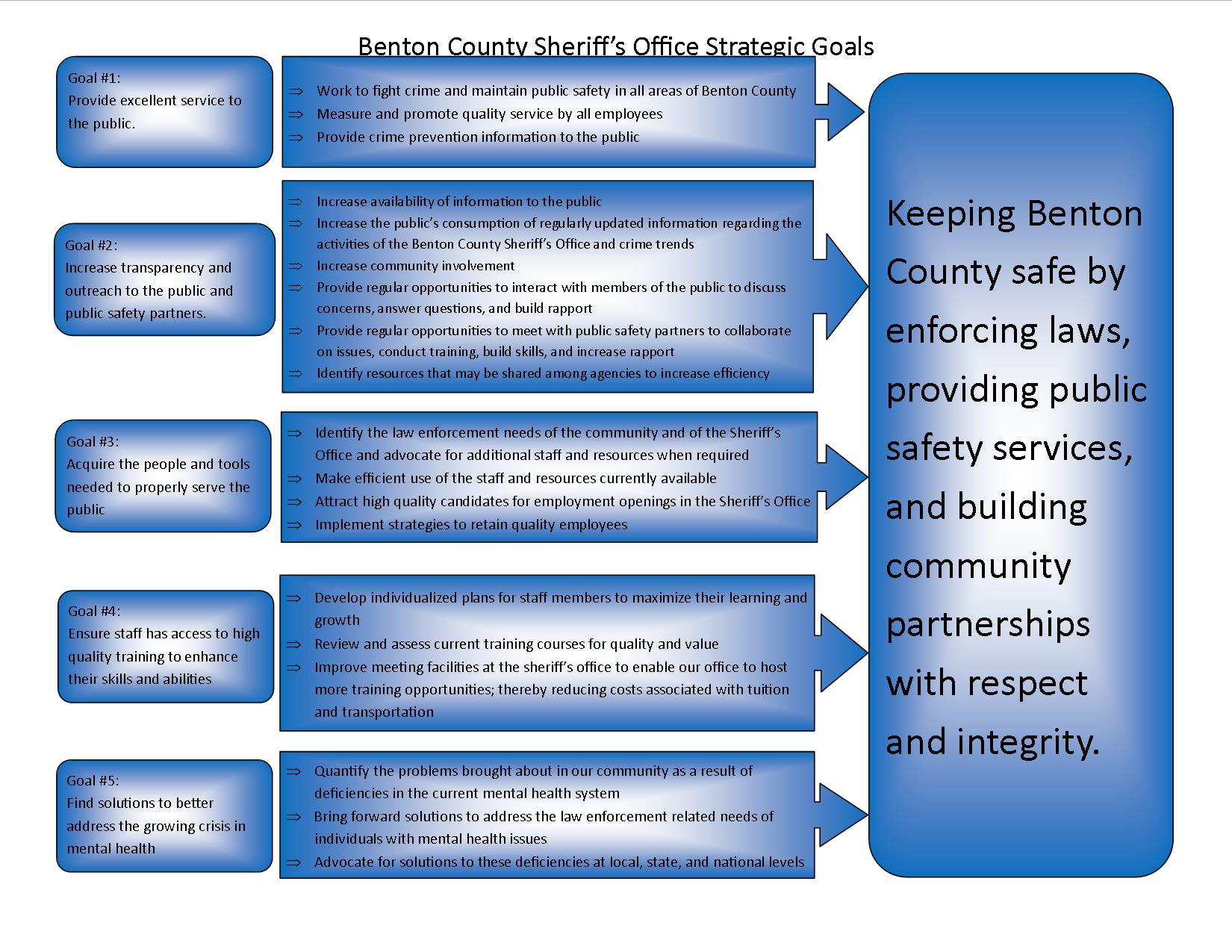 The Benton County Sheriff’s Office has made a plan to help guide their work in keeping Benton County safe. This plan focuses on enforcing laws, providing safety services, and building strong partnerships with the community, all with respect and honesty. To see a summary of the plan and a visual of how it works: